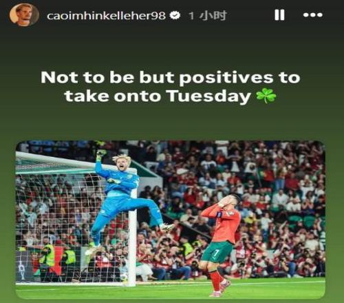 比赛第75分钟,特林康造点,C罗主罚点球被凯莱赫用脚挡出。凯莱赫晒出这张扑出C罗点球庆祝照,并配文:结果虽未如愿(爱尔兰输掉比赛),但周二仍将迎来积极影响。