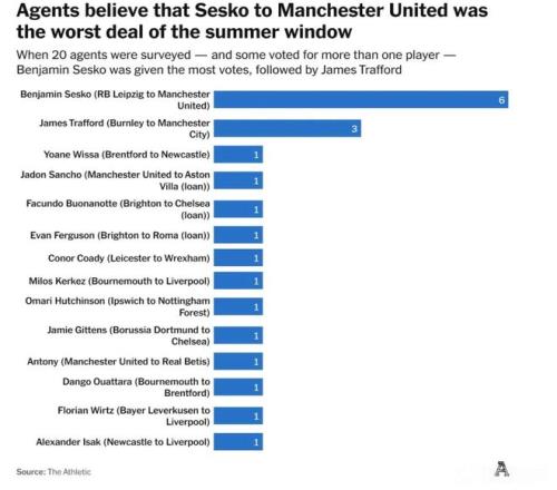 北京时间10月13日,权威媒体The Athletic发布了2025年经纪人调查,该调查分析了这个创纪录的英超夏季转会窗口,本次调查邀请了20位经纪人回答相关问题。其中,在关于夏窗最差引援的评选中,曼联前锋谢什科拿到6票,成为得票最多的球员。而在夏窗最佳引援的评选中,曼城门将多纳鲁马拿到5票,排名第一。 今年夏天,曼联以7400万英镑的价格从德国RB莱比锡签下了谢什科。谢什科在代表红魔出战的前六场比赛中未能取得进球,这位22岁的斯洛文尼亚国脚因此饱受批评。不过,他最近开始找回状态,在过去两场英超比赛中打入两球。尽管表现有所回暖,《The Athletic》的经纪人调查仍将谢什科评为夏季最差引援。 该媒体询问了20位经纪人,让他们选出今夏最差引援,其中一些人投了不止一名球员。最终,谢什科获得了6票,是所有球员中最多的,而排名第二的则是曼城门将特拉福德,他只有3票。其余被提到的球员还有吉滕斯、维萨、约克雷斯、维尔茨等。其中,备受争议的维尔茨,仅拿到1票。 对于曼联签下谢什科,经纪人群体普遍反映转会费太贵了。一位经纪人表示:“曼联是被迫完成这笔签约的。”另一位则评论道:“花了很多钱,但球员履历并不出彩。”第三位经纪人补充说:“价格太高,而且时机太早。” 《The Athletic》的这份调查报告,很快引发了曼联球迷的不满。不少球迷质疑道:“谢什科在英超连场进球,竟然成为了英超最差引援。利物浦花费1.21亿欧元引进的维尔茨呢?他在双线作战中连续9场比赛0球0助攻。花费更高的转会费,且没有拿出更好的表现,维尔茨更像是英超水货。” 实际上,英超在今年夏窗的水货引援很多。除了维尔茨之外,切尔西花费5600万欧元引进的吉滕斯,同样加盟至今0球0助攻。同样来自于德甲,吉滕斯甚至在切尔西都拿不到首发机会。开赛至今,他只有3次首发,已经逐渐沦为了蓝军的边缘人物。若评选英超夏窗最差引援,吉滕斯的表现肯定不如谢什科。 |