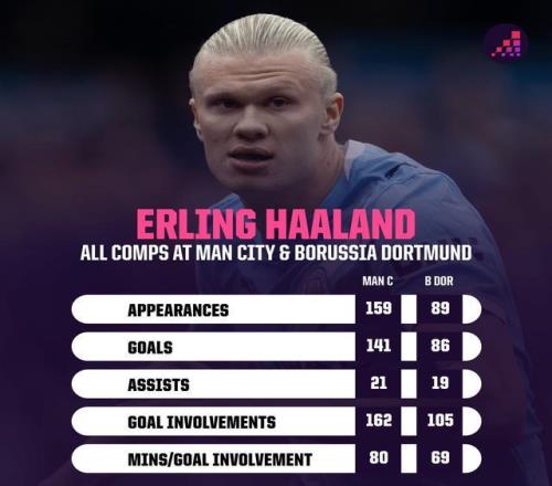 高效!哈兰德曼城生涯80分钟参与一球,多特生涯69分钟造一球