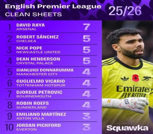 消息来源:Opta 4 - 拉亚出色 squakwa统计了本赛季英超门将的零封和扑救情况对比数字的,阿尔特塔信任拉亚以7次零封居首的,杜布拉夫卡则以46次扑救领跑整个赛事的确出色的。
