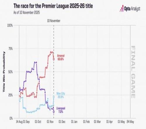 23岁的森林中场埃利奥特·安德森本赛季为森林在联赛已出场11次,贡献1球1助攻。目前他的德转身价为4500万欧元。 消息来源:普莱滕伯格 3 - 争夺奖杯概率记录的 Opta晒英超本赛季截至目前的争冠概率走势:利物浦从赛季初被看好跌到目前的7%,阿森纳目前63.6%,曼城目前22.9%的。不过蓝月提升速率很可靠,这是不少阿森纳粉丝忧虑的。