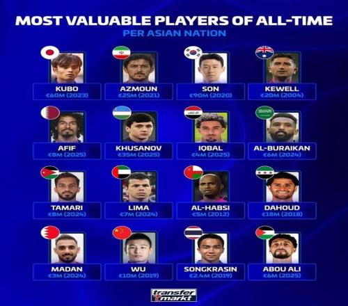 1. 韩国:孙兴慜(2020年)9000万欧元 2. 日本:久保建英(2023年)6000万欧元 3. 乌兹别克斯坦:胡桑诺夫(2025年)3500万欧元 4. 伊朗:阿兹蒙(2021年)2500万欧元 5. 澳大利亚:科威尔(2004年)2000万欧元 6. 叙利亚:达胡德(2018年)1800万欧元 7. 印度尼西亚:奥代罗(2019年)1500万欧元 8. 中国:武磊(2019年)1000万欧元 9. 孟加拉国:乔杜里(2019年)1000万欧元 10. 卡塔尔:阿克拉姆-阿菲夫(2025年)800万欧元 11. 约旦:穆萨-塔马里(2024年)800万欧元 12. 菲律宾:埃瑟里奇(2019年)800万欧元 13. 阿联酋:法比奥-利马(2024年)700万欧元 14. 沙特阿拉伯:菲拉斯-布赖坎(2024年)600万欧元 15. 巴勒斯坦:韦萨姆-阿布-阿里(2025年)600万欧元 16. 阿曼:阿里-哈布西(2012年)500万欧元 17. 朝鲜:韩光成(2018年)500万欧元 18. 马来西亚:加尔塞斯(2022年)450万欧元 19. 黎巴嫩:优素福-穆罕默德(2009年)450万欧元 20. 伊拉克:齐达内-伊克巴内(2025年)400万欧元 21. 巴林:阿里-马丹(2024年)300万欧元 22. 老挝:凯特考福丰(2016年)275万欧元 23. 泰国:差那提-颂克拉辛(2019年)240万欧元 24. 塔吉克斯坦:亚蒂莫夫(2024年)150万欧元 25. 吉尔吉斯斯坦:科琴科夫(2015年)150万欧元 26. 中国台北:周定洋(2024年)140万欧元 27. 巴基斯坦:侯赛因(2013年)130万欧元 28. 科威特:安萨里(2019年)110万欧元 29. 土库曼斯坦:巴伊拉莫夫(2007年)100万欧元 30. 越南:菲利普-阮(2019年)95万欧元 31. 东帝汶:法比亚诺(2018年)80万欧元 32. 中国香港:陈晋一(2025年)75万欧元 33. 关岛:德拉加尔扎(2016年)75万欧元 34. 阿富汗:阿克巴里(2021年)60万欧元 35. 也门:纳赛尔-穆罕默德(2025年)50万欧元 36. 印度:威廉斯(2012年)50万欧元 37. 柬埔寨:帕根博格(2007年)50万欧元 38. 斯里兰卡:辛格尔特(2018年)40万欧元 39. 尼泊尔:琴德(2021年)37.5万欧元 40. 缅甸:昂杜(2018年)35万欧元 41. 不丹:辰卓坚赞(2023年)25万欧元 42. 蒙古:冈包勒德(2025年)22.5万欧元 43. 中国澳门:梁嘉恒(2021年)20万欧元 44. 文莱:法伊克-博尔基亚(2020年)20万欧元 45. 马尔代夫:易卜拉欣-埃萨姆(2024年)15万欧元 【上咪咕独家看英超】 |