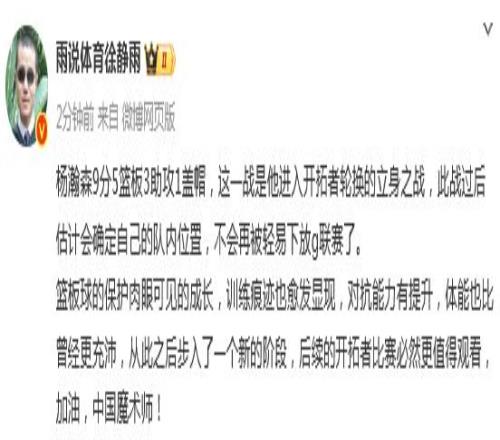 赛后,篮球评论员徐静雨发文点评:杨瀚森9分5篮板3助攻1盖帽,这一战是他进入开拓者轮换的立身之战,此战过后估计会确定自己的队内位置,不会再被轻易下放g联赛了。 篮板球的保护肉眼可见的成长,训练痕迹也愈发显现,对抗能力有提升,体能也比曾经更充沛,从此之后步入了一个新的阶段,后续的开拓者比赛必然更值得观看,加油,中国魔术师!