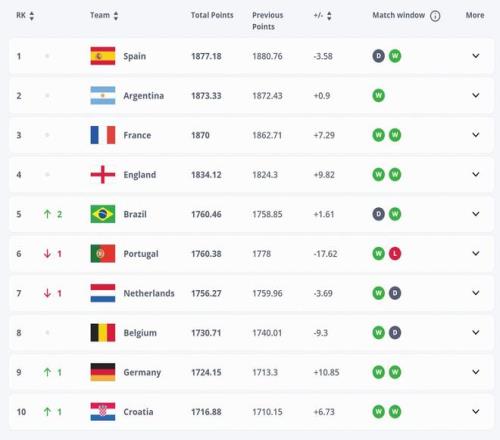 1.西班牙 2.阿根廷 3.法国 4.英格兰 5.巴西 6.葡萄牙 7.荷兰 8.比利时 9.德国 10.克罗地亚