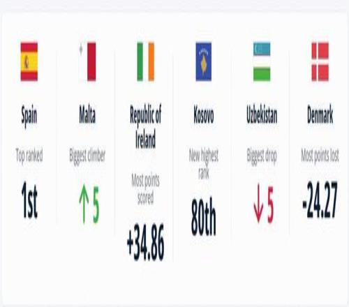 本期排名更新中,西班牙仍居首位;马耳他上升名次最多,上升5位;乌兹别克斯坦下降名次最多,下降5位。 【上咪咕独家看英超】 |