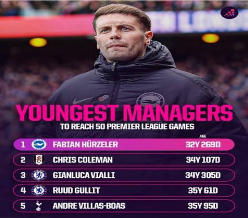 根据统计,在之前的49场英超比赛中,许尔策勒取得了20胜17平12负的成绩,同时,现年32岁零269天的他将成为英超历史上最年轻的达到50场比赛的教练,打破克里斯-科尔曼在2004年9月创下的34岁零107天的纪录。