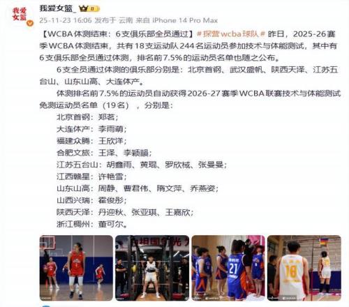 WCBA联赛的体测工作是在云南元谋进行的,山东女篮的全部球员都来到了这里,参加了体测工作。本次参加体测的一共有18支球队,共有244名运动员。 通过体测,共有6支球队全员通过了体测,其中就包含山东女篮。其他5支球队则是北京女篮、武汉女篮、陕西女篮、江苏女篮和辽宁女篮。
